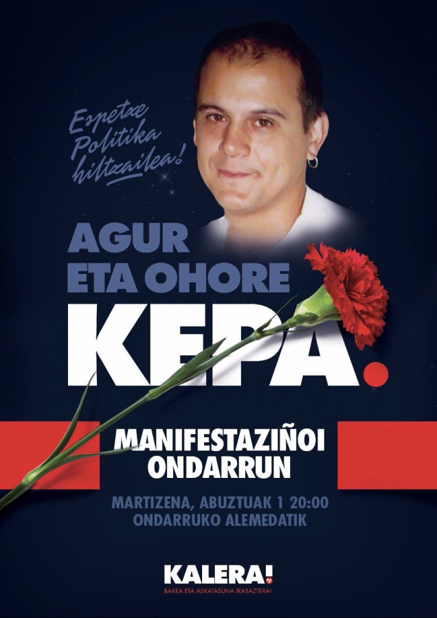 Gaur triste esnatu de Euskal Herrixe! Kepa del Hoyo Euskal preso politiku hildde espetxe politikin ondorixoz Badajozeko kartzelan (700KM) 20 urte bahitxute eon eta gero ! Espetxe politika honeaz amatxu bihir dou! Preso eta iheslai politikuk ETXEA!