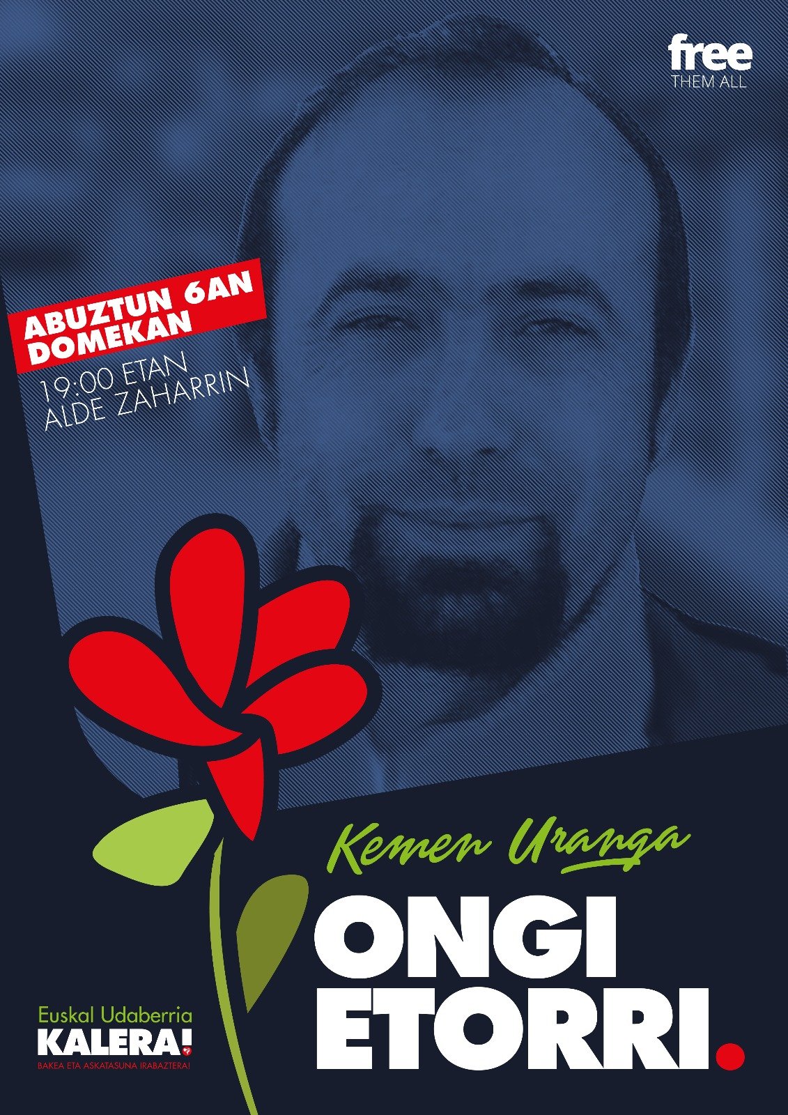 19:00 ak pasautxu aia da Kemen Ondarrure! 12urte erbestin eta 5 eitxuz espetxin! Herritxarrok harrera ederra ein dotsau, bai kartzela aurrin eta batxe herrire aiaaz batea alde zaharrin ! ONGI ETORRI KEMEN! Kemeneaz batea danak ekarri bir douz herrire!