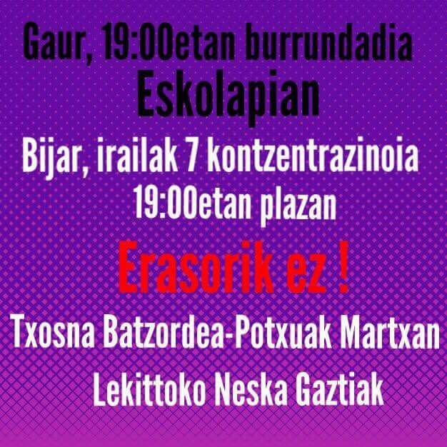 Gaur jakin dou Lekatxoko Antzar egunin (irailak5) emakume bat bortxatu ebela. Horren aurrin herritxar guztik mobiliza eta eraso larri hau gogor salatzeko atzo eskolapin burrunbadi einben eta gaurko KONTZENTRAZIÑOI da deitxute Lekatxoko plazan 19:00etan “Txosna batzordi, Potxuak Martxan eta Lekittoko neska gaztiak” deitxute.