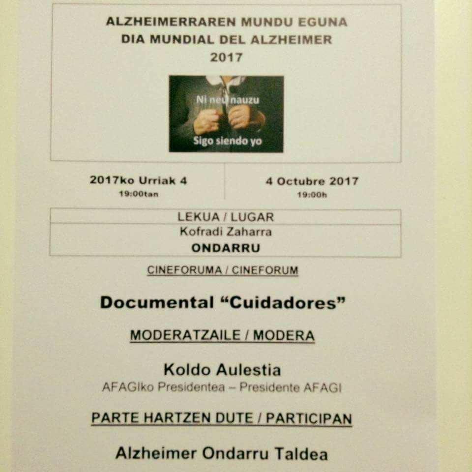 Oraingo honetan Urriaren 4an kofrai zaharreko aretoan emango den “CUIDADORES” dokumentala ikustera gonbidatzen zaituztegu. Dokumental hau Alzheimer gaixodun zaintzaile errealekin grabatua da, bertan beraien eguneko bizipenak kontatzen dituzte.