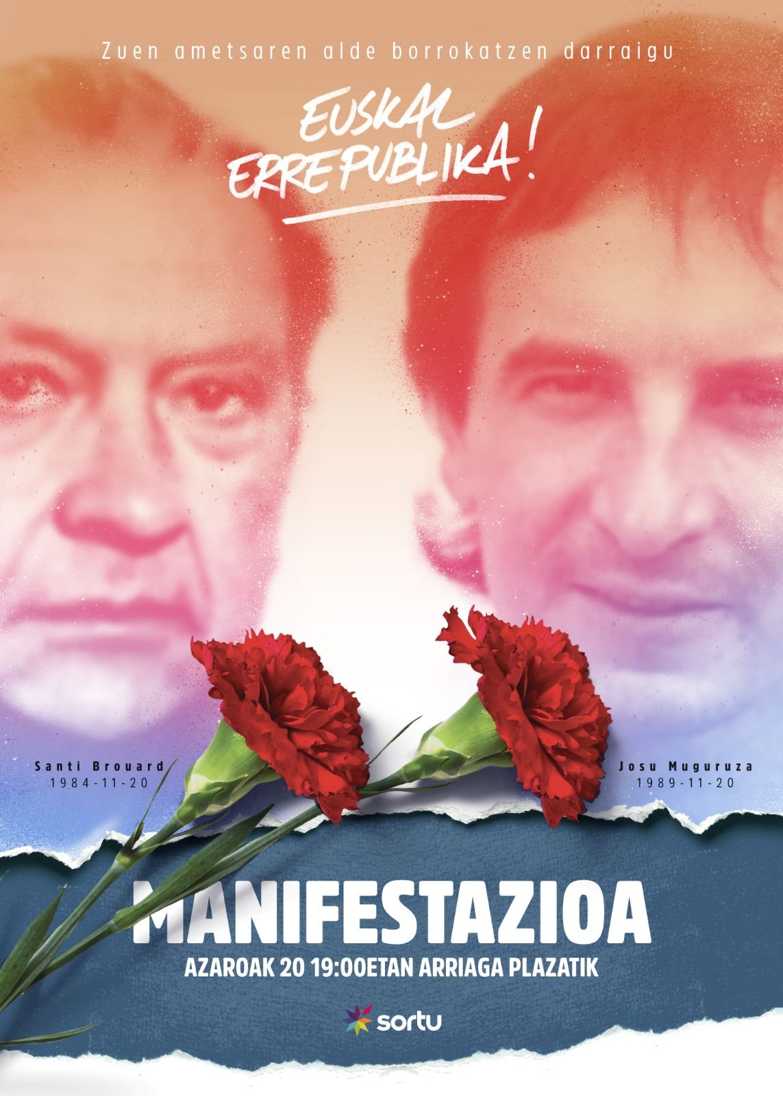 “Zuen ametsen alde borrokan darraigu. Euskal Errepublika!”hori de aurten ibiliko dan lelu. Bixak azarun 20xan hil zitxuezen, Santi Brouard (1984an) eta Josu Muguruza (1989an). Euskal Herrixan askatasunan aldeko militantik ixan zin. Borrokalari nekaezinak, elkarrizketetako pertsona iraixak, pediatri bata, kazetarixe besti; buruzagi karismatikuk, diputatu; independentistak, sozialistak; guraso, lagunak, burkidik: herrixan militantik, finin. Omenaldi nausixe Bilbon engo batze be manifestaziñoi baten bidez, Lekatxon be ekitaldi xume bat eingo dabe eguerdiko ordu batetan.
