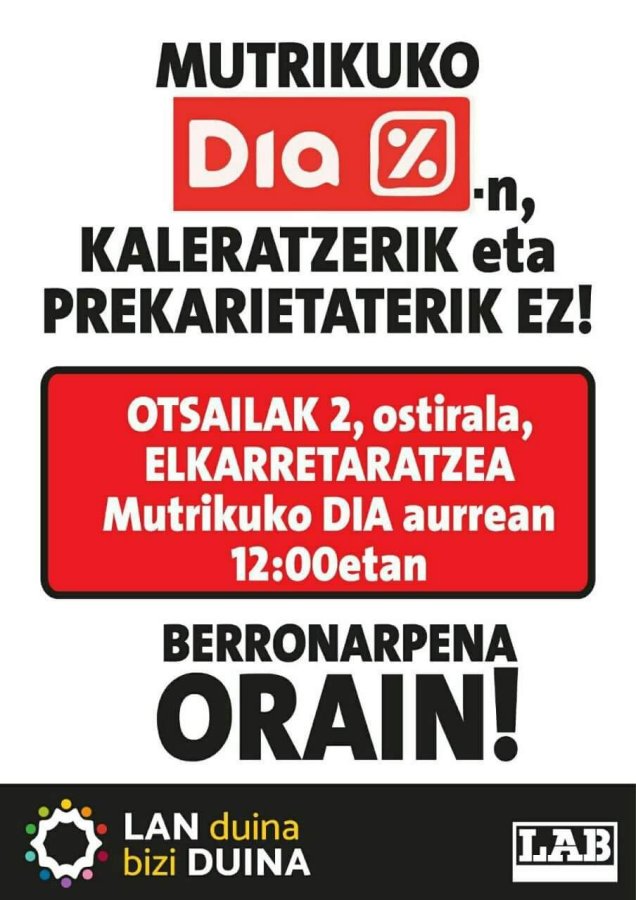 Hauxe mezu eta kartela zabaldu dau LAB sindikatuk Mijoako DIAn egon dan kaleratzin ingurun, eta deixe etxen dabe Otsailak 2, baixakun 12:00etan DIAn aurrin elkarretaratzin parte hartzeko!