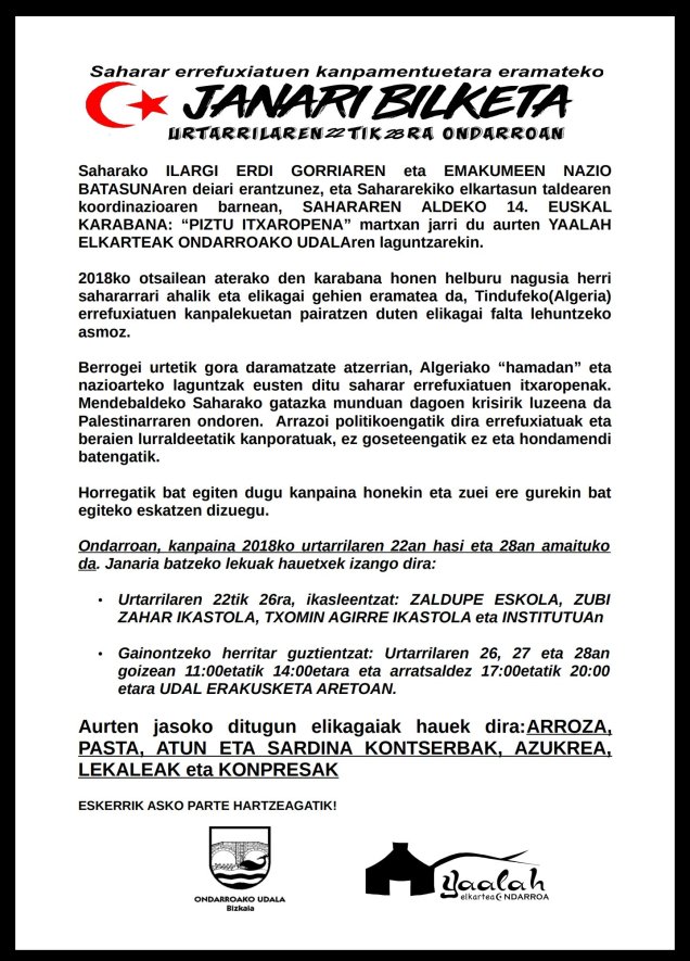 Yaalah Elkartik eta Ondarruko udalak Euskal Herriko elkartasun karabanan Tindufeko(Argelia) saharar kanpamentuta eruteko JANARI BILKETI eingo dau datorren aste guztin.