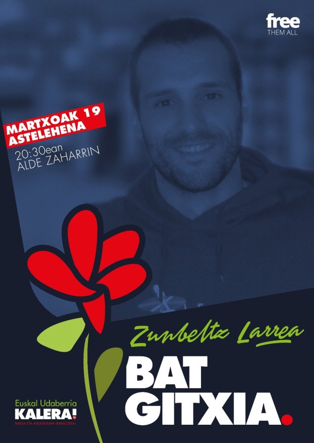 Astelehen honetan, kartelak diñon modun BAT GITXIA eukikou barrun eta horrek BAT GEXA eukikouela kanpun nahi dau esan! 15urte ta erdi eta gero geure artin egongo da ZUNBELTZ LARREA AZPIRI euskal preso politiku!