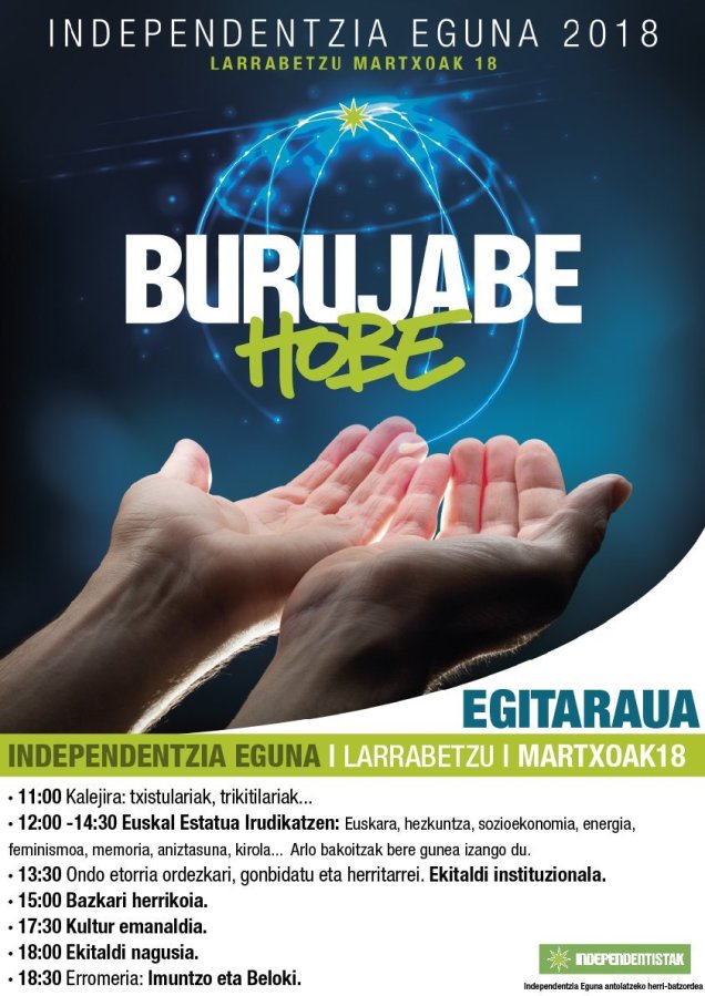 Bixar Larrabetzun “Burujabe hobe” lemapin INDEPENDENTZIA EGUNE ospatuko da! Egun guztiko egitarau antolatu dau “Independentista sareak”.