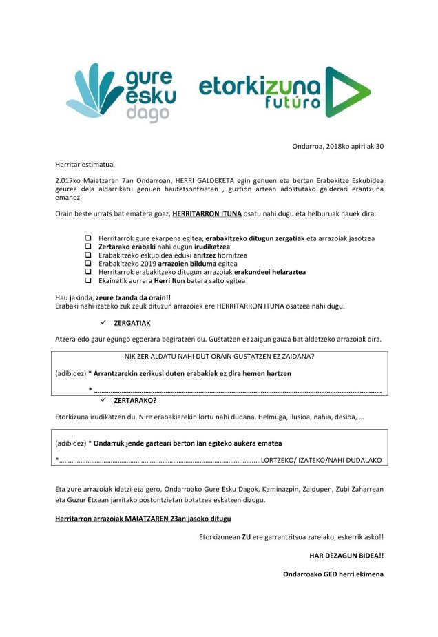 Ekainak 10eku gizakate sinple bat baño askoz be gexaua ixango da, Euskal herritxarrok gure etorkizun politikuaz zelan, zeatxik… eta erabakitxeko dakauzen arrazoik mahai gainin ipini eta herritxar libre eta zoixontzuk nahi douela ixan aldarrikatuko dou alkarrei eskutik agarrata!