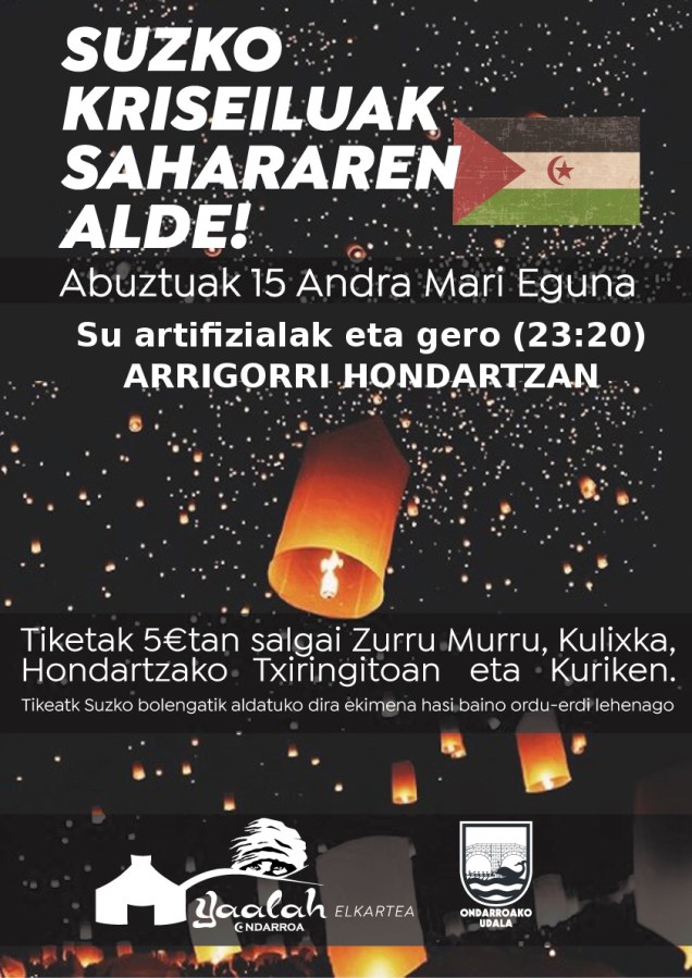 Yaalah elkartik eta Ondarruko udalak Saharar herrixan alde diru lortzeko Suzko kriseiluk aireratzeko ekimena antolatu dabe, ekimen hau abuztuk 15in (Andramai egunin) gabeko 23:20 aldea (su artifizialak amatxu eta zeixan) ixango da.