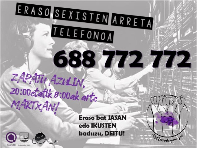 ZAPATO AZULIN eraso sexistan arreta telefonu egongo da martxan! BILLURRAK GUAZ JAI!