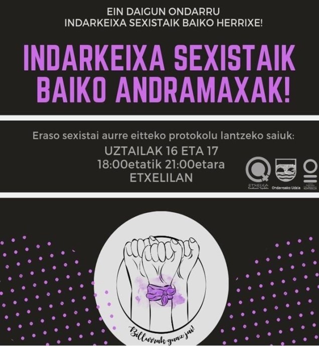 Eraso sexista baiko Andramaxak eukitxeko asmuaz, erasuai aurre eitteko protokolun lanketa saiuk egongo diz uztailan 16 eta 17an etxelilan.