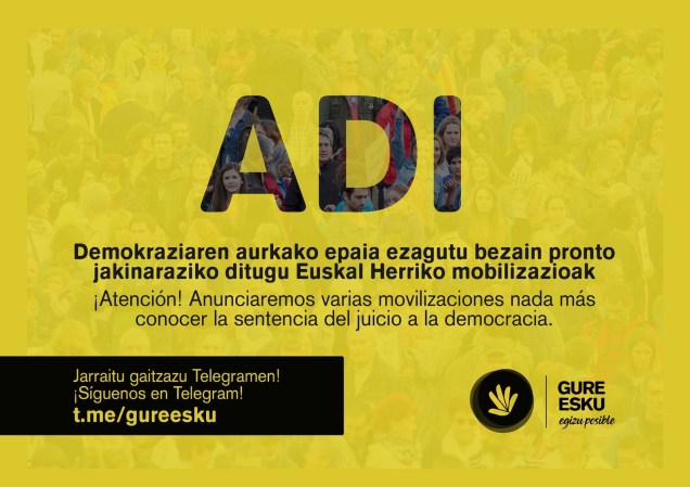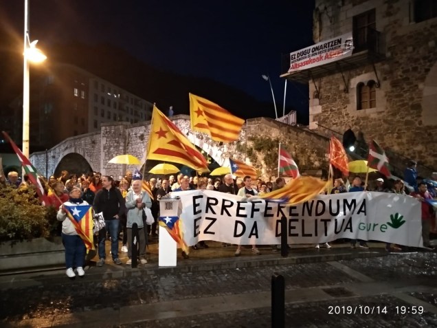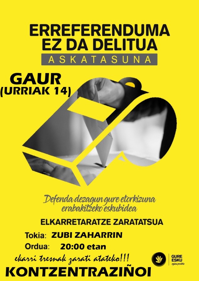 KATALUNYAk bixi daben egoerin aurrin kalea urten birdouela ikusten dou, ixan be bueltan bueltan geuri be ikutu etxen dosku gaixak, ta hori dala ta manifestaziñoi bat antolatu dabe GURE ESKU DAGOkuk. Berta juteko autobusak antolatu diz herrixan. Ixenak ALAI eta AMARRATZA tabernetan eta KURIKE dendan emon bihir diz. Autobusak Zaldupetik urtengo dabe arratsaldeko 4 retan.