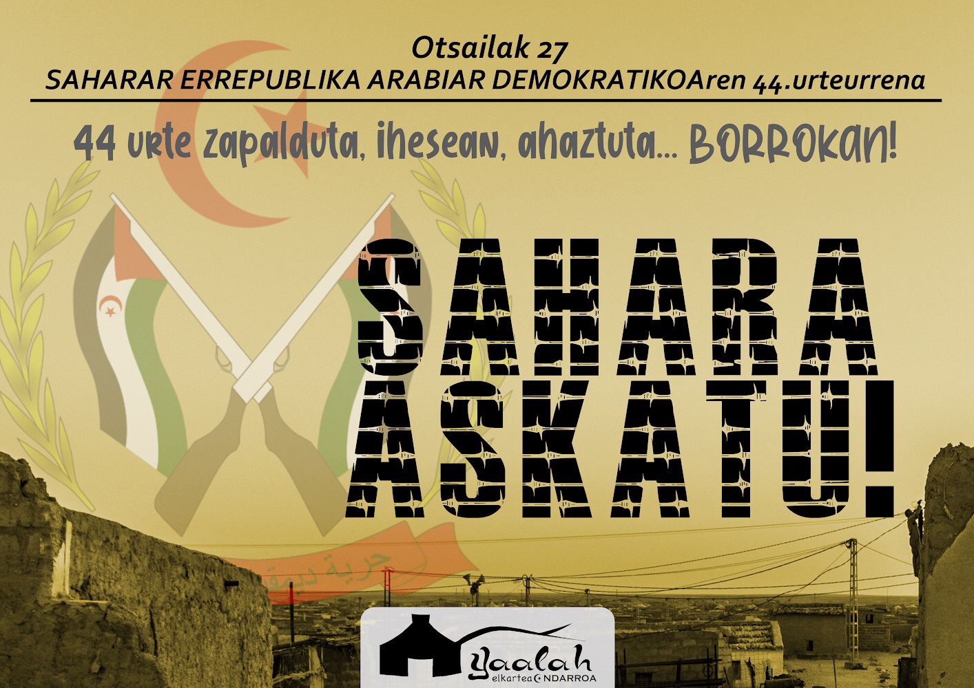 Egun hau dala eta Ondarruko saharan aldeko Yaalah elkartik kartel hau ata dau eta Ondarruko Udalak saharar banderi ipini dau mastan. SAHARA ASKATU!