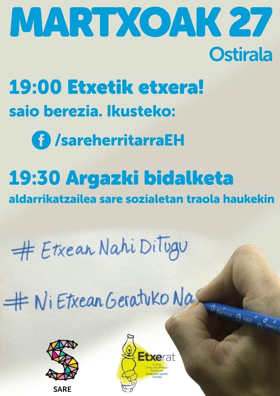 Hori dala eta, gaurko erronki, ETXERAT eta SAREk deittutako ekimenin partehartzi ixango da. 19:30etan aldarrikapenenez betetako argazkixak/bideuk ata eta sare sozialeta altza. #EtxeanNahiDitugu eta #NiEtxeanGeratukoNaiz traolak ibilli gero zabaldu ahal ixateko. Turrunea be bixaltzen badozu… Primeran!