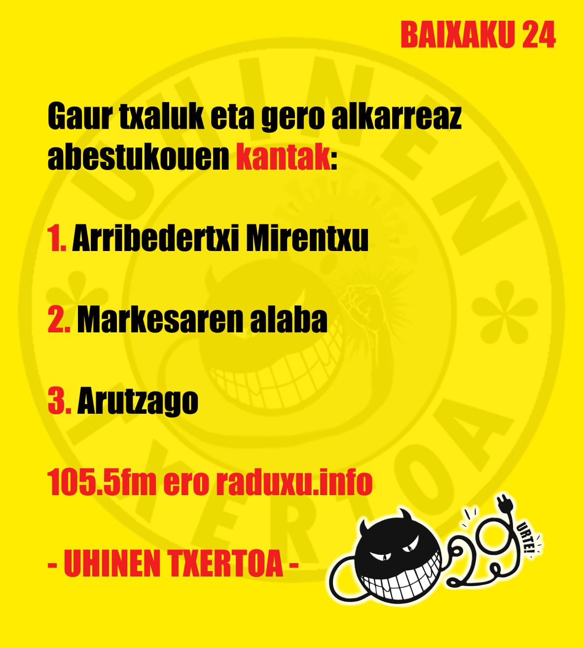 Honetxek diz gaur txaluk jo eta gero Radixu Irratian eukiko douzen abestixak. Gogoratu, abestixak entzun eta gero Uhinen Txertoa irratsaiu eukiko douela 22:00ak arte 105.5FM edo Radixu.info n.