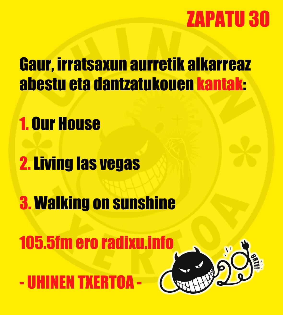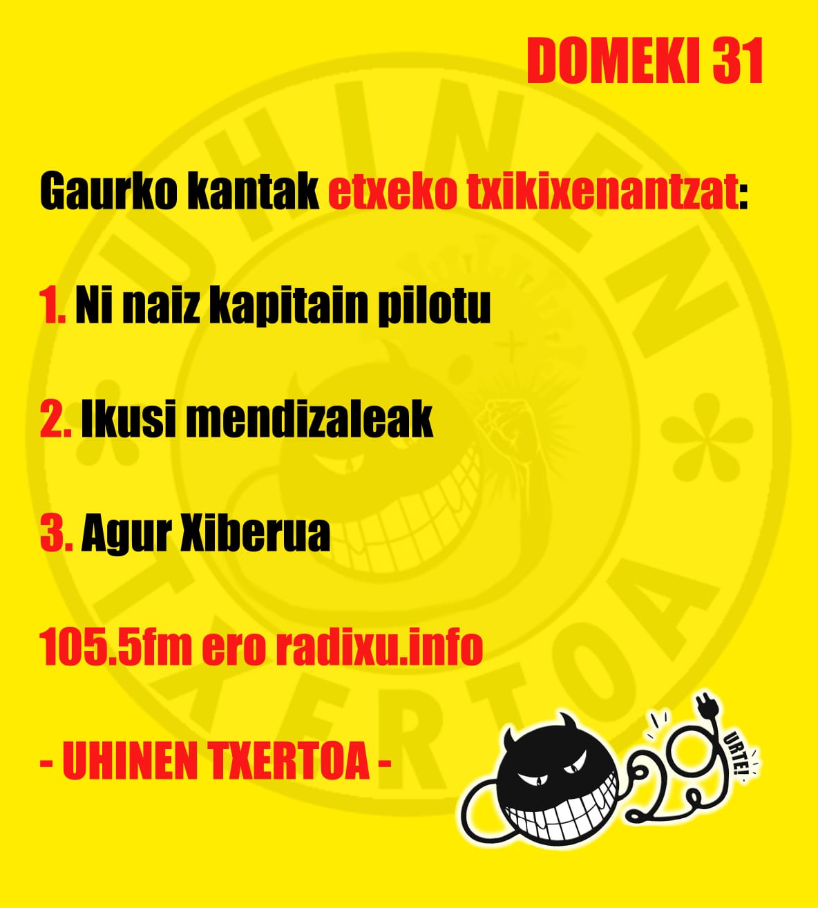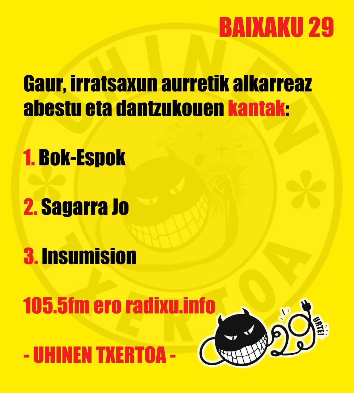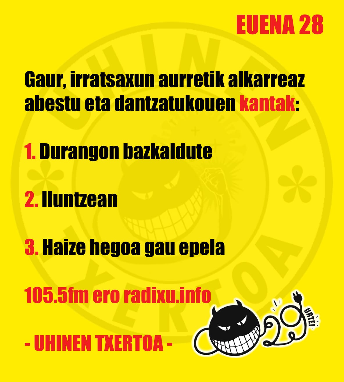 Honetxek diz gaur Radixu Irratixan eukiko douzen abestixak. Gogoratu, abestixak entzun eta gero Uhinen Txertoa irratsaiu eukiko douela 22:00ak arte 105.5FM edo Radixu.info n.