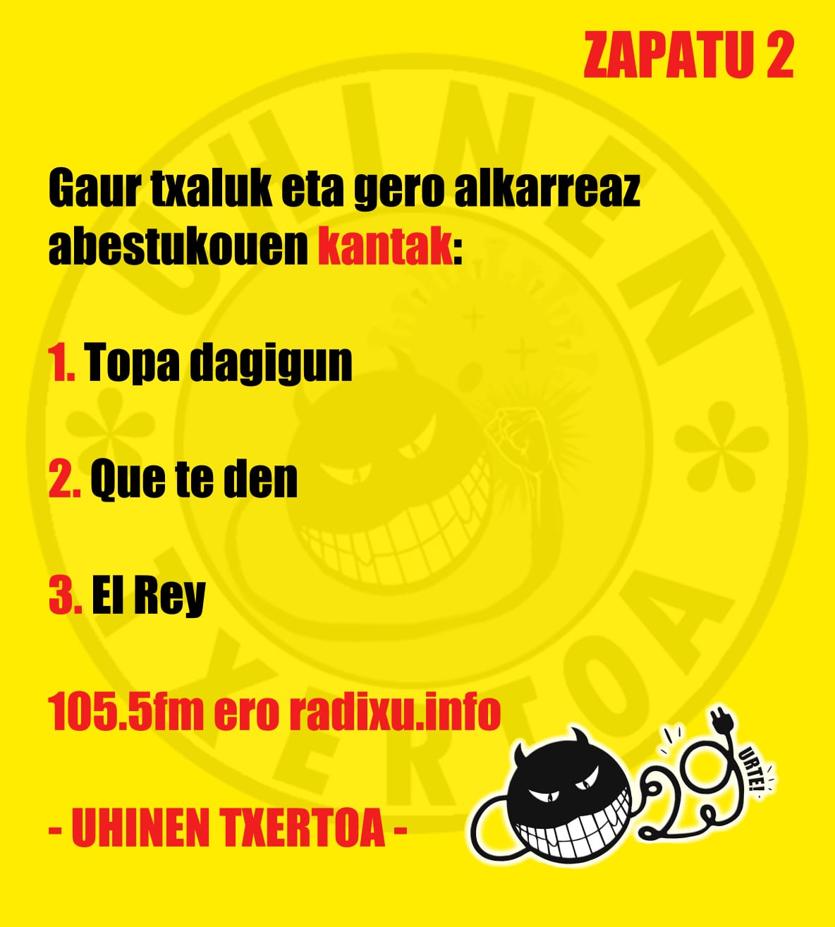 Honetxek diz gaur txaluk jo eta gero Radixu Irratixan eukiko douzen abestixak. Gogoratu, abestixak entzun eta gero Uhinen Txertoa irratsaiu eukiko douela 22:00ak arte 105.5FM edo Radixu.info n.