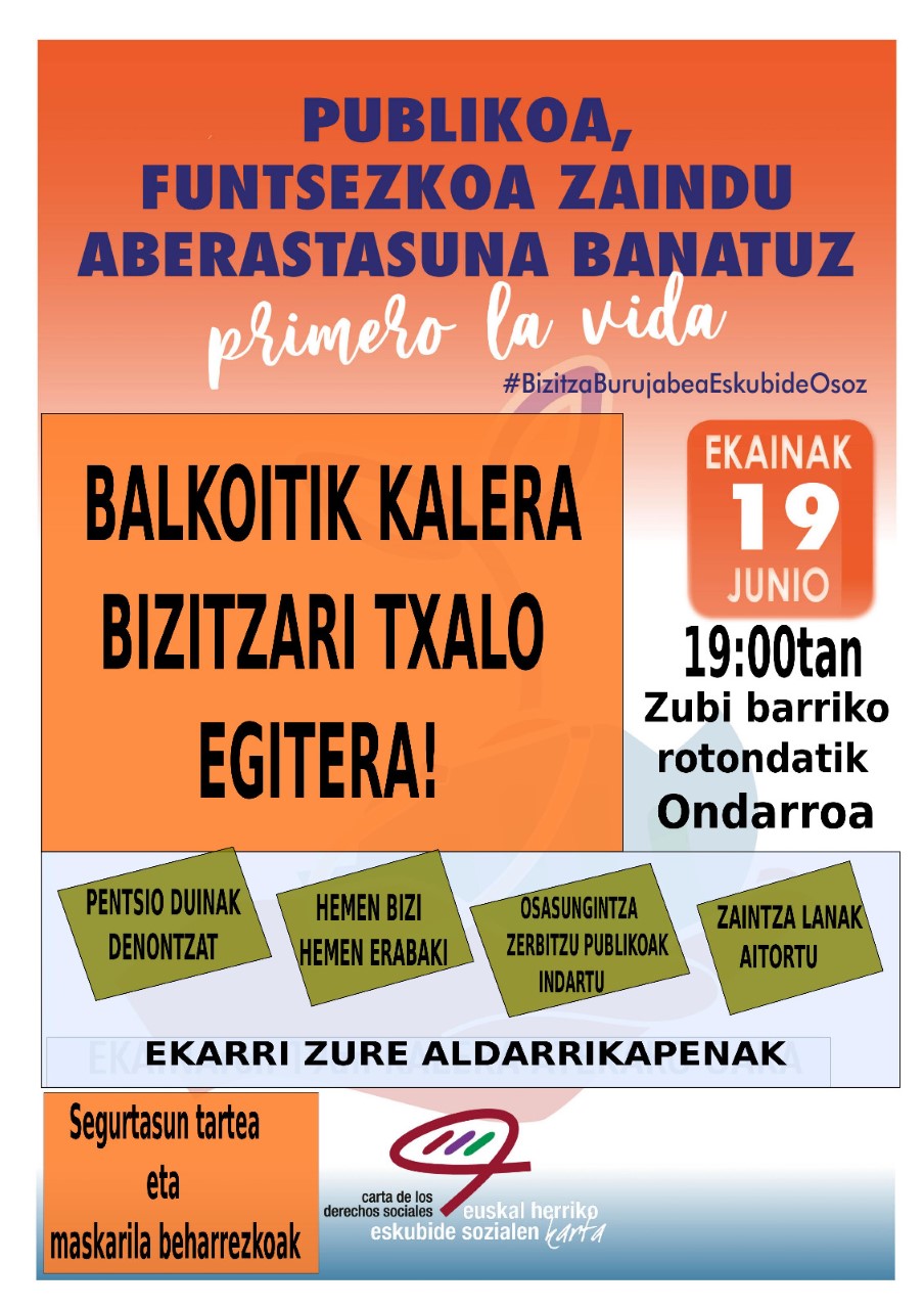 Zubi barriko rotondan batuko gaz ongoxe baixakun (E-19) arratsaldeko 7 retan. Segurtasun tartiaz eta maskarillak soñin bakotxak beran aldarrikapenak eskutan: PENTSIO DUIÑAK DANONTZAT, HEMEN BIZI HEMEN ERABAKI, OSASUNGINTZA ZERBITZU PUBLIKOAK INDARTU, ZAINTZA LANAK AITORTU….. Nahi dabenak nahi dabena aldarrikatuz!