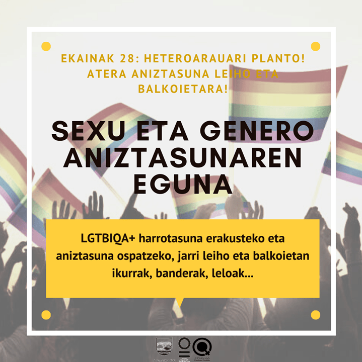 Aurten be, Ondarrun sexu eta genero aniztasune harrotasunez bizi douela aldarrikatuko dou, heteroarauai planto eginez. Emakume Kontseilutik leiho eta balkoitxatik aniztasunan aldarrixe zabaltzea dei egiten dotzuau, gure herrixan fobiak lekoik ez daukela esatea eta gure herrixak harrotasunez sexu aniztasune aldarri dauela. Banderak, pankartak, kartelak eskuz etxea trebatu garenez, sormena erabili eta zabaldu dezagun sexu eta genero aniztasunan aldarrixe Ondarruko etxitatik lau haizeeta!