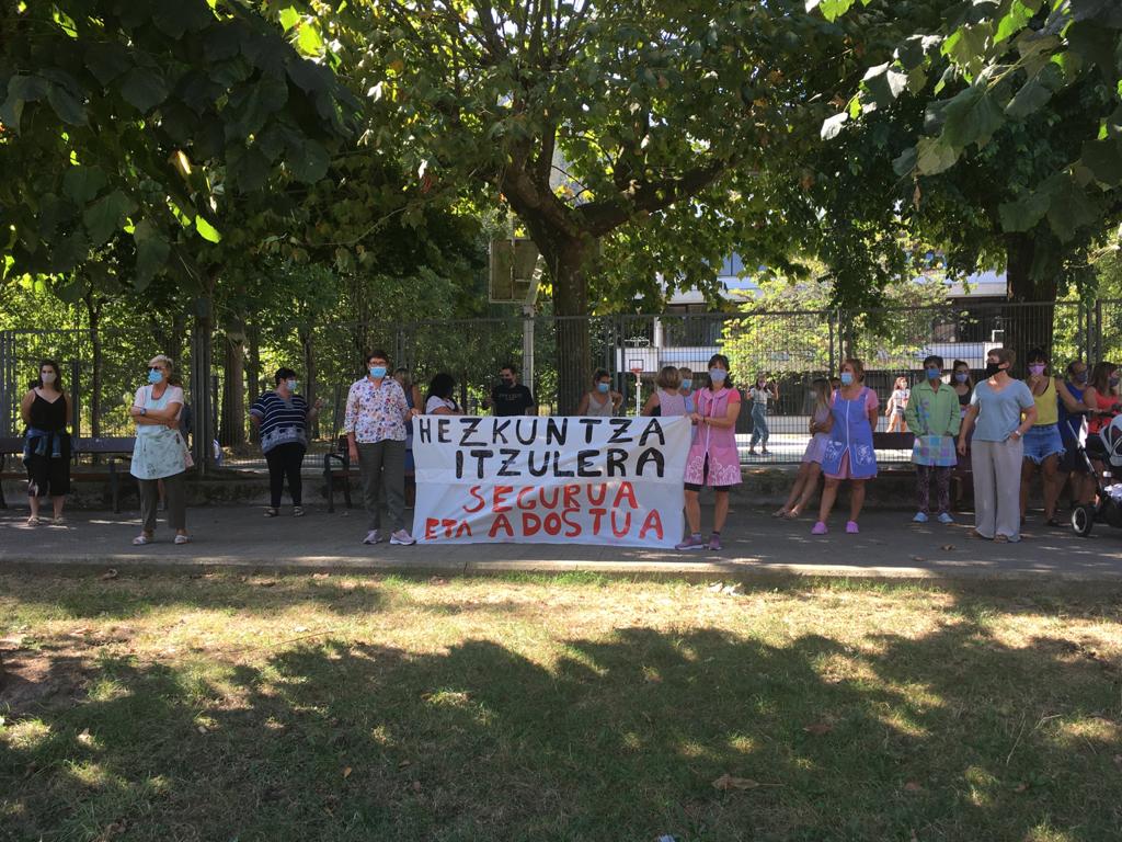 ZUBI-ZAHAR Herri kastolako langilik deitute, ikastola aurrin elkarretaratzi ein dabe “Hezkuntza itzulera segurua eta adostua” lemapin,” gaurko greba deialdiko aldarrikapenakin bat etxen douelako” esan dabe bertan batu dizenak.