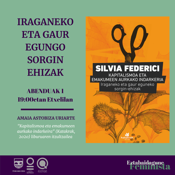 Hitzaldixai buruz: “Kapitalismoa eta emakumeen aurkako indarkeria” liburun, Silvia Federicik “Caliban eta Sorginak” liburun bertsiñoi laburtu eta irakurteaz bat eskaintzen dosku, bañe ez hori bakarrik. Horreaz batea, gaur egun Afrikako zenbait herrialdetan eta munduko beste toki batzutan gertaten ari diren sorgin-ehizak be aztertzen dotxu, eta azaltzen dau zelan XVI. eta XVII. mendeetako sorgin-ehizen eta gaur egunekoen atzin arrazoi berak ezkutatzen direla.