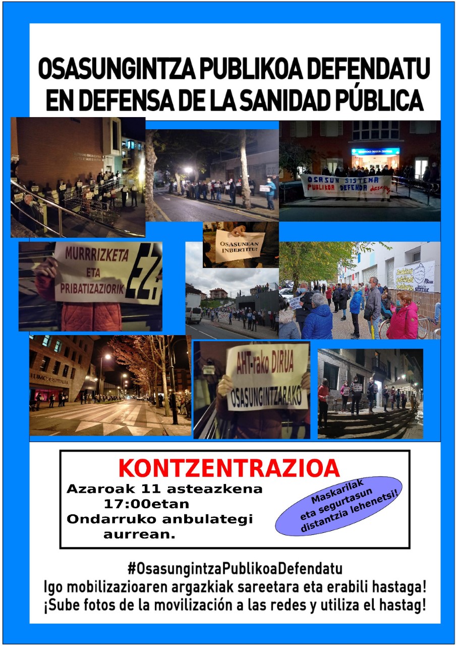 Pasan astin eingendun latxeik, datorren eguaztenin (A-11) arratsaldeko 5 etan anbulatoxo aurrin batuko gaz OSASUNGINTZA PUBLIKUN alde. Inpuesto bidez kobraten doskuzen diruk, era egokixin erabiltxeko eskatzetzau gure agintarixai. Adibidez, Abiadura handiko trena albo baten laga (dirutzak daz gastaten bertan) ta benetan birdouzen gauzatan gasta birdiz danon diruk, tartin OSASUNGINTZAN.