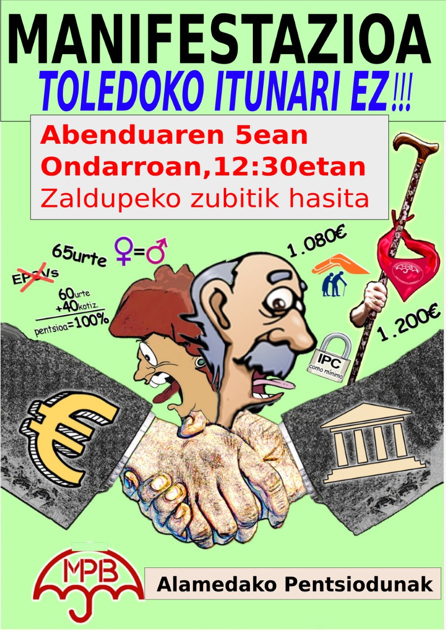 Alamedako Pentsiodunak, abenduan 5 in 12.30 xetan,Toledoko Itunan ondorixun aurkako manifestaziño eingo dou Ondarrun, Zaldupeko zubitik Alameda.