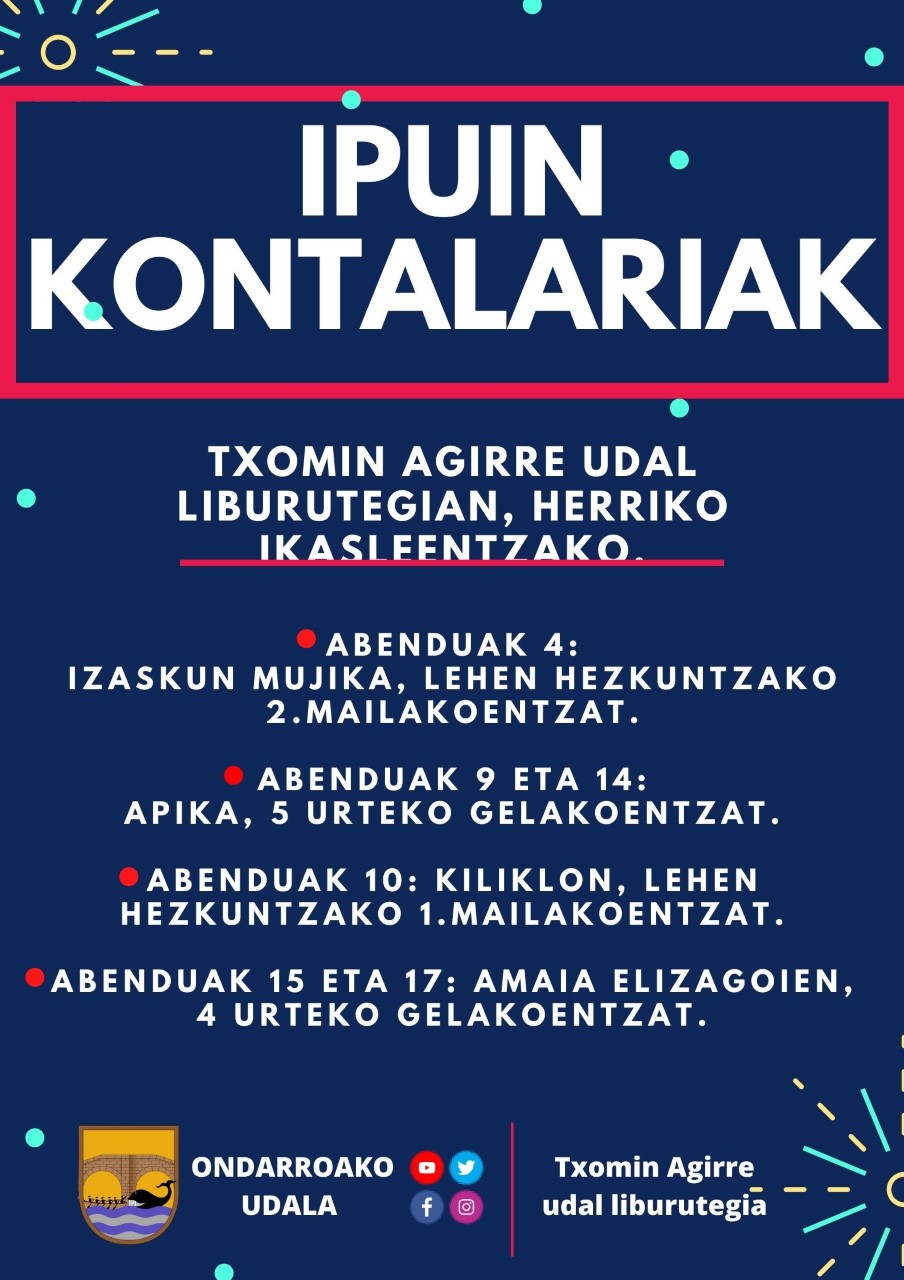 Txomin Agirre udal liburutegixan ipuin kontalaxan saiuk eongo diz hilabete honetan herriko ikaslintzat. Lehenengo saiu ongoxe baixakun ixango da (Abenduak 4).
