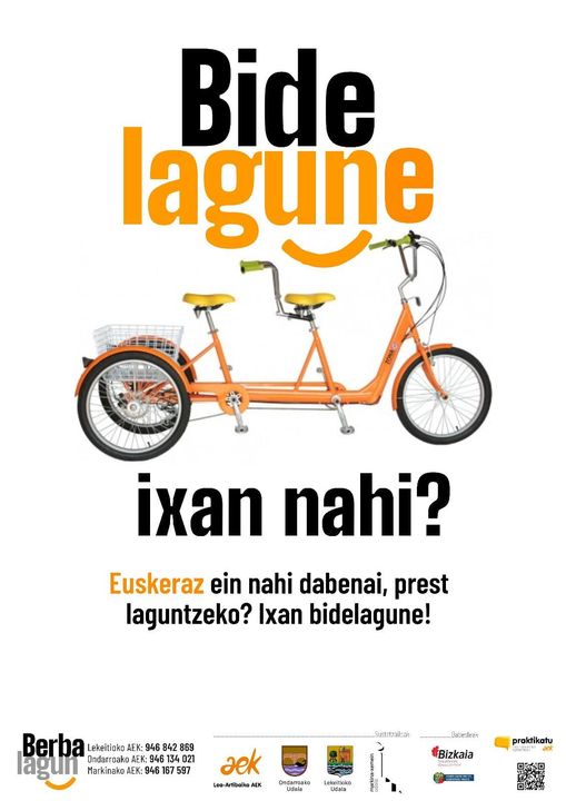 Kartelak esaten daben latxeik Bide Lagune ixan nahi? Zetako? Ba EUSKERAZ ein nahi dabenai laguntzeko. Pentsaten badozu esko bat bota zeinkela anima eta hurreatu A.E.K. ko bulegure edo azpixan dan telefonure deitxuaz.