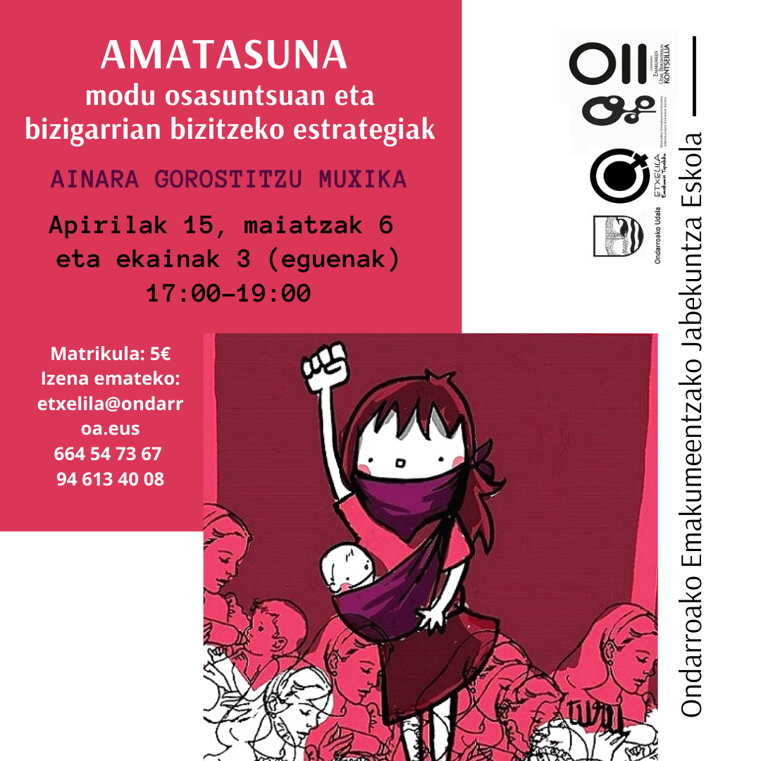 “Amatasuna modu osasuntsu eta bizigarrian bizitzeko estrategiak” ikastaru, Ainara Gorostitzu Muxikan eskutik. Gaur eta hemen amatasuna exijente eta zail etxen daben harixak ikusi eta teorixa feministin eta amatasunan histoixako ekarpenakin, hausnarketa pertsonalakin eta talde dinamikakin amatasunan praktika eta esperientzia bizigarriagoak billatzi ixango da ikastarun egiteku. Beti be, egite horrek dakarren ahalduntzi eta interpelazio politiku ere helburu ixango ditugularik.