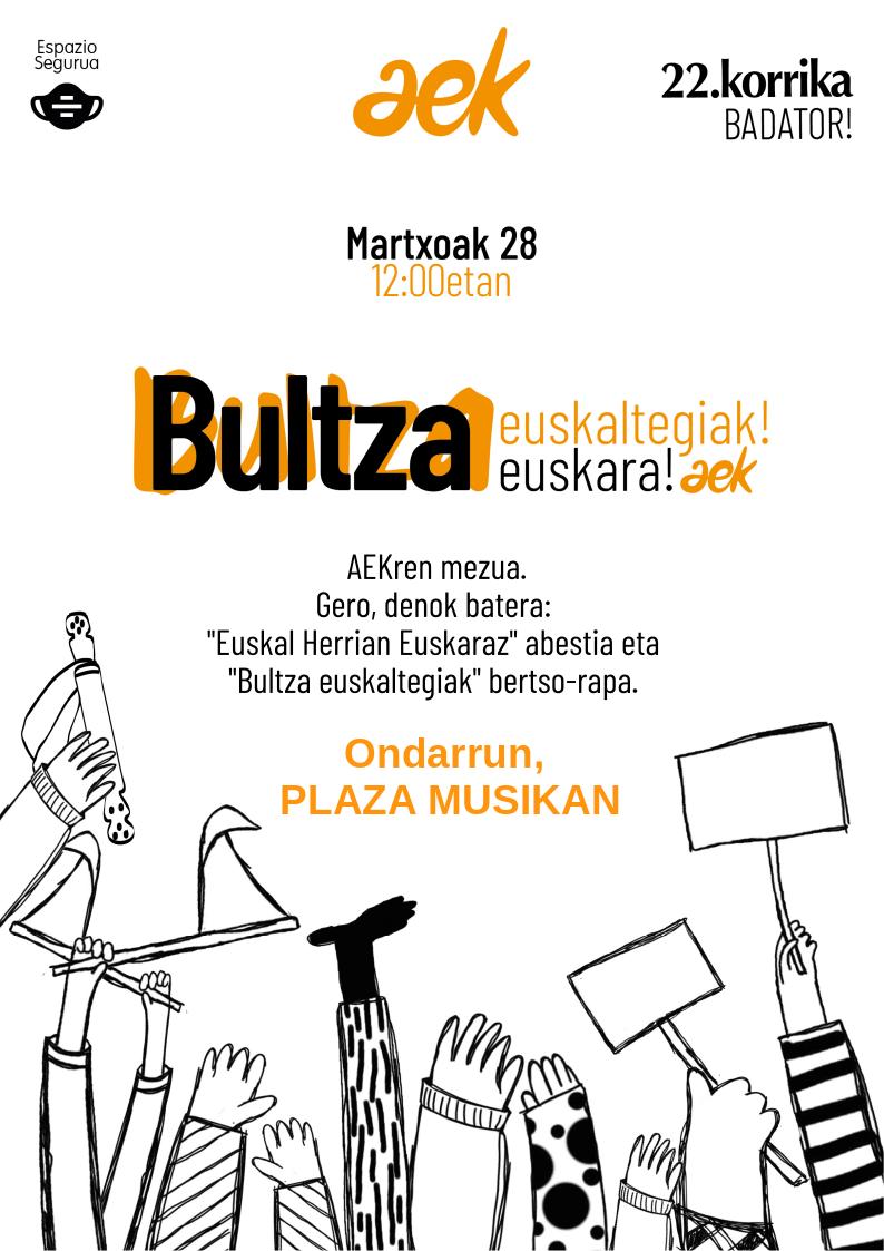 Ongo domekan eguerdiko hamabixetan Plaza Musikan batuko gaz Ondarrun beste herri askotan batuko dizen latxeik. Onezkeo jakingo dozue aurten 22. KORRIKA ein bizala bañe…. mamarro kristuk dana hainkaz gora bixaldu dau. Horrek suposatzen daben hutsuni beteteko ekitaldi xumik eingo diz, AEKn mezuk irakurriaz gain EUSKAL HERRIAN EUSKARAZ abestuko da bertan.