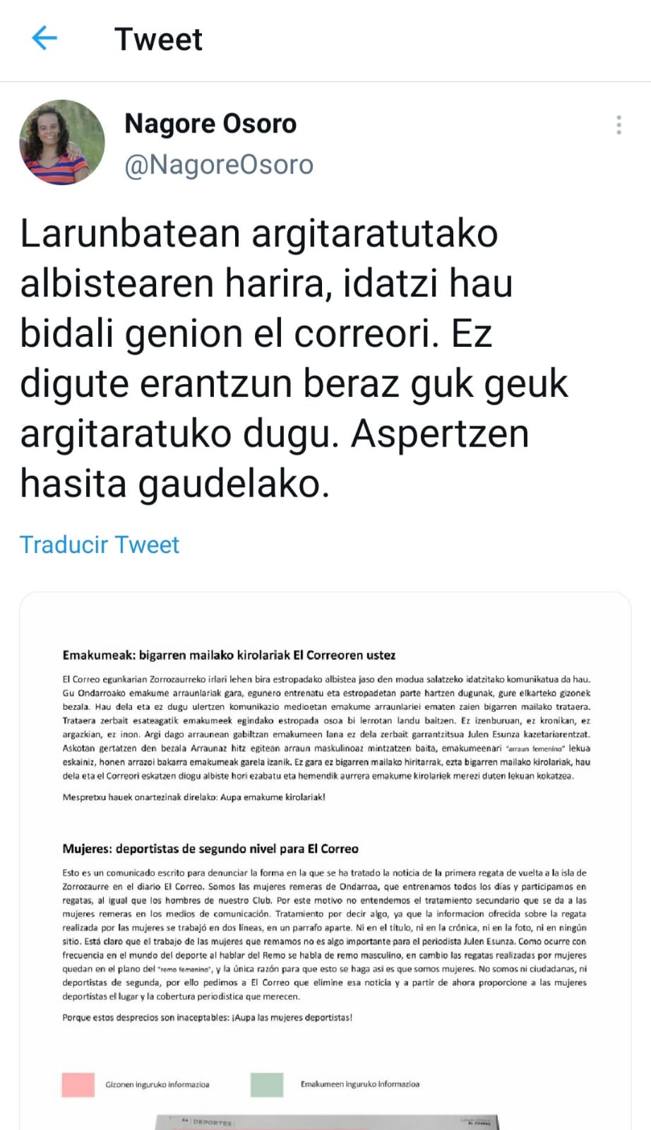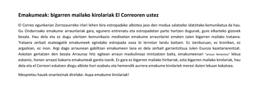 Emakumin inbisibilzaziñoi esparru askotan emoten da, kirolin asko, eta erramun… Ondarruko emakume erramolaxak, El Correok atatako kronikan, emakumiai emoten gakoen trataeri salatuz komunikau bat bixaldu eben El Correoa baine, honek erantzun be ez dotsanez ein, publiko eitti erabaki dabe.