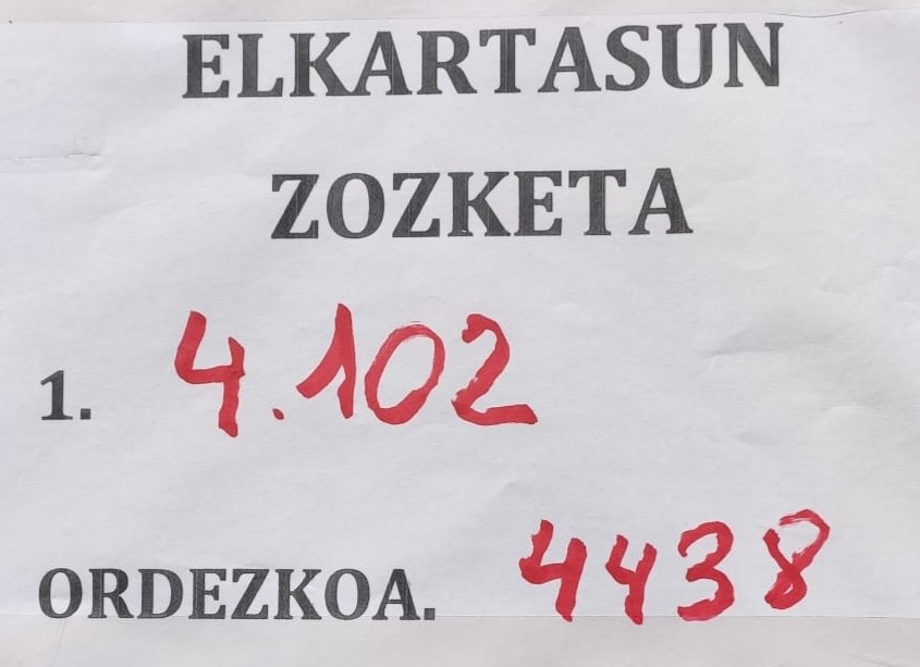 Gaur goxetik eon diz kalekutzeko eskillaretan ELKARTASUN zozketatko boletuk saltzen PRESUN eta IHESLAXAN aldeko lagunak. Gaurkun billots eder bat euken otzaran eta hau ixan da zenbaki irabazli. Zoixonak toka gakonai!