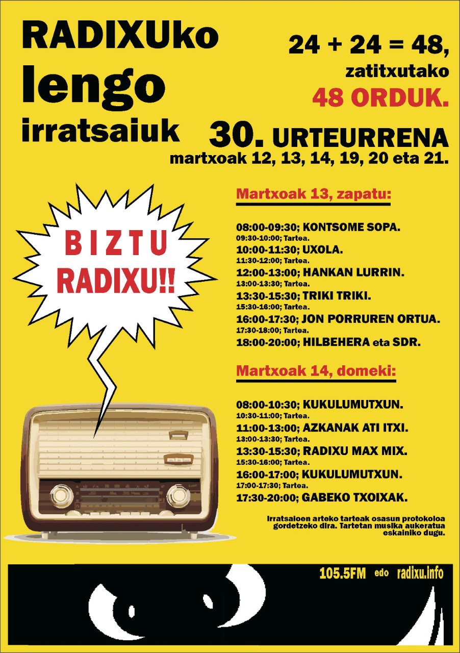 Martxoak 12, 13, 14, 19, 20 eta 21 in ospatuko dabe RADIXU irratixan 30. urteurrena, programaziñoi berezixaz gain kontzertuk be eukikouz. Aurten 48 orduko irratsaiu bi zatitxan banatu dabe, bakotxe 24 ordukuk. Hamen dakazue Martxoak 13 eta 14 ko irratsaiuk, lena etxezin irratsaixun arduradunan ahotik.