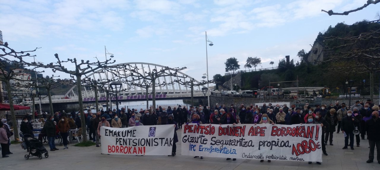 Irudi hau ikusi dou gaur eguerdixan Alamedan. Betiko pankartiai beste bat gehitxu gako, EMAKUME PENTSIONISTAK BORROKAN, soñin pañuelo Lilaz ikusi douz parte hartzalle asko. Martxoak 8xe barneratu dabe gaur bertan batu dizenak, ONEKAn (Emakume Pentsionistak) idatzixe irakurri dau herrittar batek, PENTSIONISTI eta EMAKUME modun dakarren aldarrikapenak birgogoratutxuz eta euren borrokin ardatzak azaldutxuz.