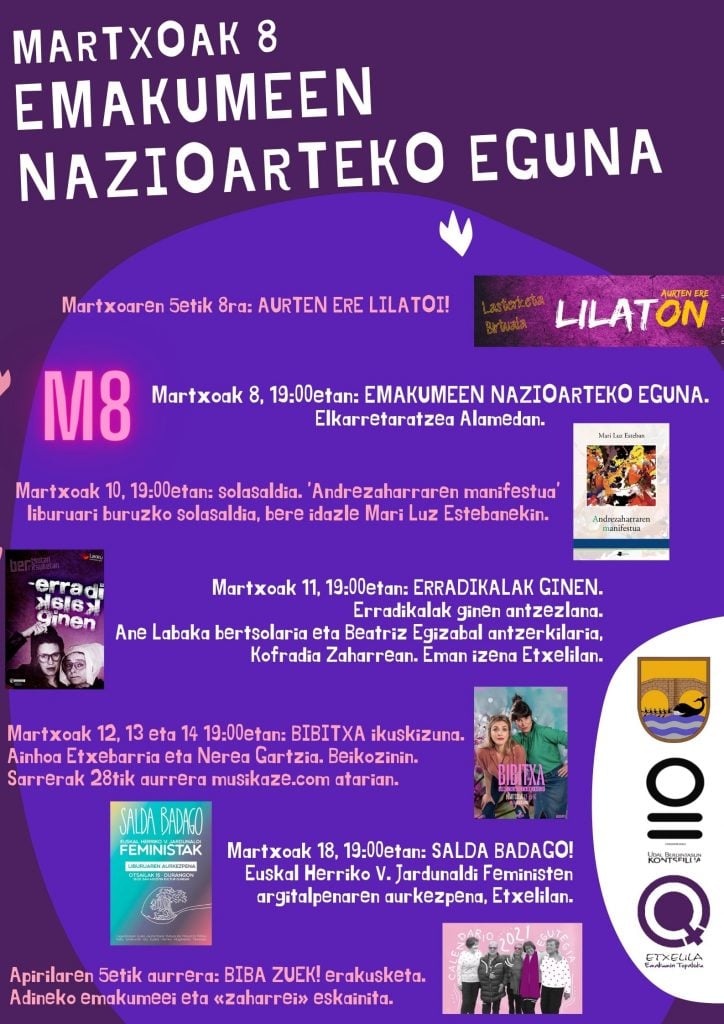 Egitarau zabala prestatu dabe aurtengo EMAKUMIN NAZIOARTEKO EGUNE ospatzeko. Antzezlana, ikuskizune, aringaingaldixe, manifestaziñoi, solasaldixe…erreibindikaziñoiz betetako egune!