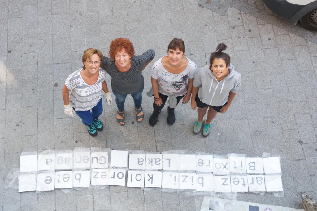 Etxelila ingurun ibili dizenak seguru gogoratzen dabela Itziat hitzaldixetan edo ikastarutan edo talde lanetan, aringainga taldin….Emakume geldi ezine, langilli, gozu, beti errespetuz eta laguntasunetik. Bittore Lakan omenez, 14 lagun batu zin hilabetitan tzir eskuz baldosak etxen ikasteko, eta bai ein be elegante! Tartin euan Itziar bera. Iraileko azkanengoko eguraldi ederreko asteburu aprobetxa ben, boskote bat kalea urten eta Bitxore gogoratzen dozkun irudixe herrixan ipintxea jun.