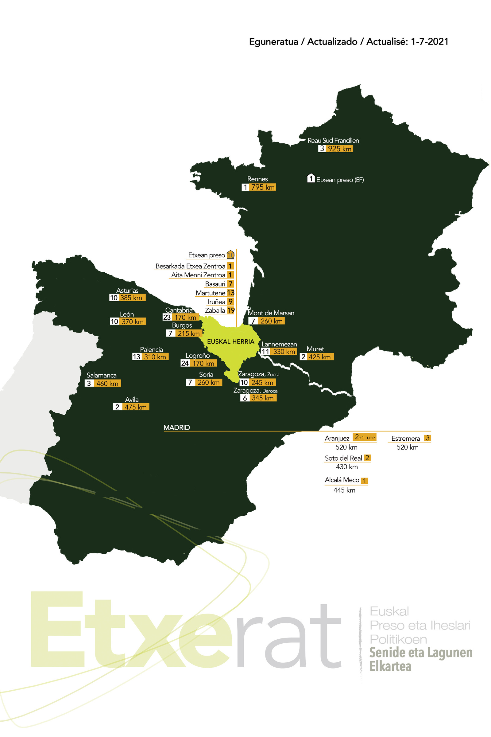 Irudi honek erakusten dau gaur egunin EUSKAL PRESO POLITIKUK nundik noa kartzelaratute dazen. ETXIN! egon bihir dizela argi dakau guk, bañe hori esanaz batea Dispertsiñoiaz amatxu beharra dala be argi dakau. Atzoko albistik entzun ta gero, Españiko kartzeletan dazen PRESUK, Madrilgo kartzelak ixango diz apartien egongo dizenak. Zer suposatzen dau horrek? Istripuk eukitxeko arrisku gitxiaua, koste ekonomikuk zer esan biharrik bez, kidik batuaua,…Utopixiaz beti sinistu ixan dou, bañe pragmatikuk gaz, hainkak lurrin dakauzelako ta badakiauelako aurkarixak ez doskule oparririk eingo, DANAN ETXERATZI eskatzen jarraitxukou, bai kalin bai eskatu birdizen tokixetan.