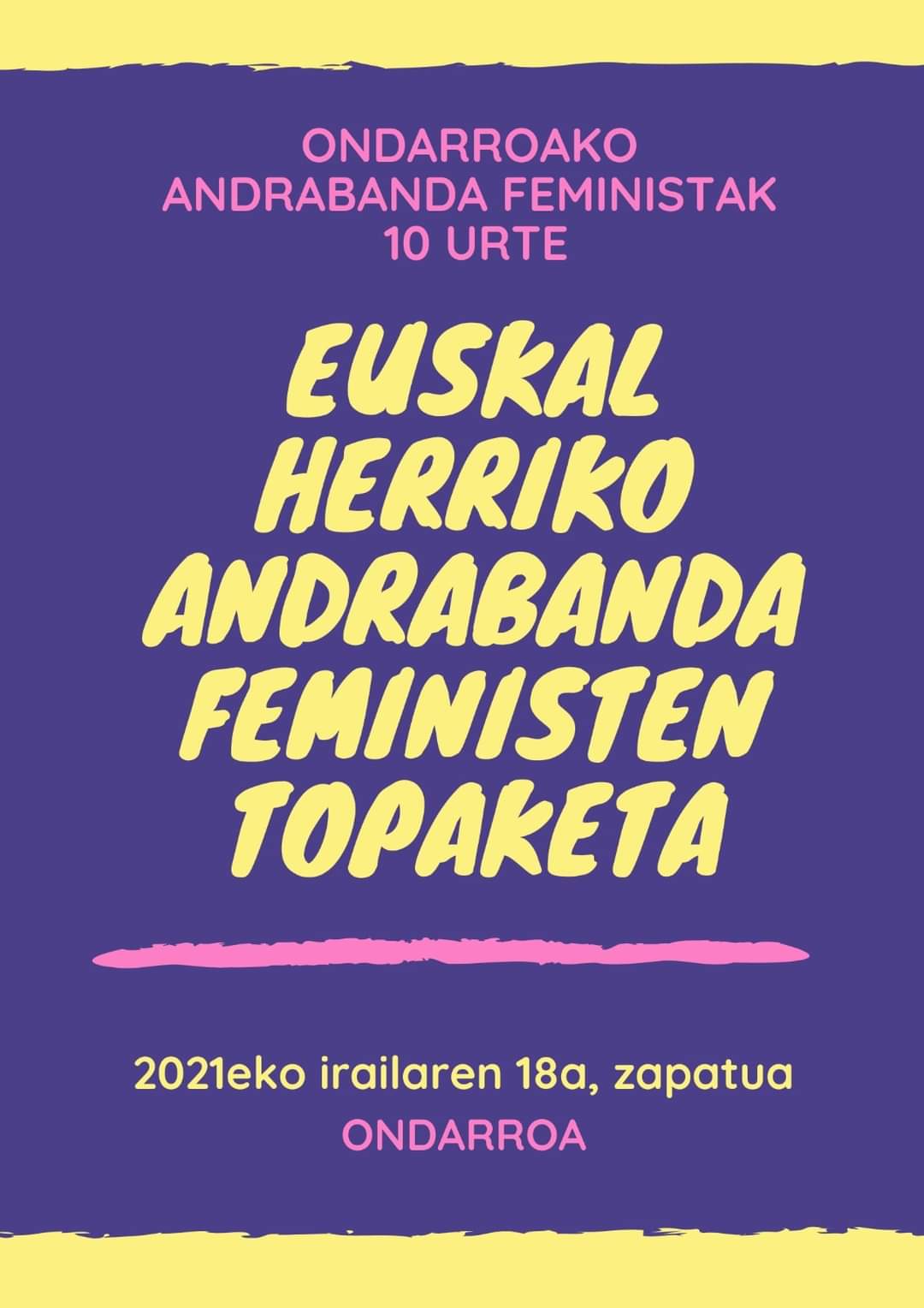 Ondarruko Andrabanda Feministak aurten 10 urte betetzen dituela eta, ospatu egin nahi dugu urteurren borobil hori. Ospakizunerako egune, irailaren 18a, zapatu, izendatu dou. Egun horretan hainbat ekitaldi eukikou: batetik, Euskal Herriko perkusio talde feministak Ondarrun batzeko asmu dakau, alkarreaz Topaketi ein, hausnartu eta proposamen barrixak pentsatzeko eta kalik hartzeko; bestetik, prestatzen ari garen urtemugako dokumentala aurkeztuko dou, feminismun erreferente dizen gonbidatu bereziek lagundute; eta, gañea, ahizpatasun bazkari ederra egingo dou.Gustoa ospatuko geunke egun hori zuekin batea; beraz, gurera gonbidatute zaze. Ondo izan eta laster arte! Ondarroako Andrabanda Feminista