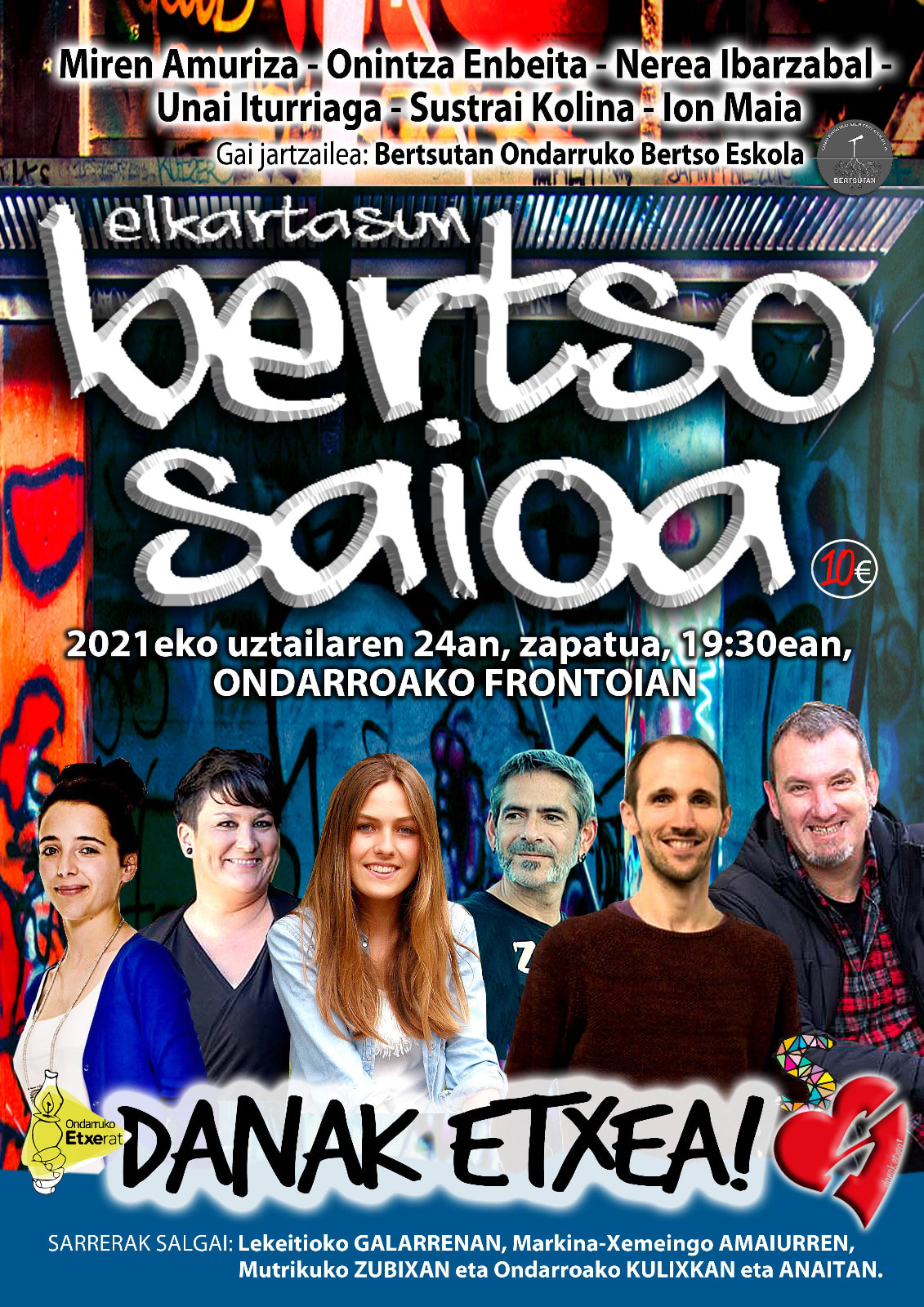 Punta puntako bertsolaxak eukikou herrixan herriko frontoin Uztailak 24 an, Onintza Enbeita, Nerea Ibarzabal, Miren Amuriza, Sustrai Kolina, Ion Maia eta Unai Iturriaga ta gai jartzalle lez Bertsutan Ondarruko Bertso Eskolako kidik ibiliko diz.10 euron trukin, 400 sarrera ipinitxuez saltzen, Ondarrun, Kulixkan, Anaitasunan eta turismo bulegun; Berritxun, frontoin; Lekatxon, Galarrenan; Markina-Xemeinen, Amaiurren; eta Mutrikun, Zubixan eta Txalapartan.
