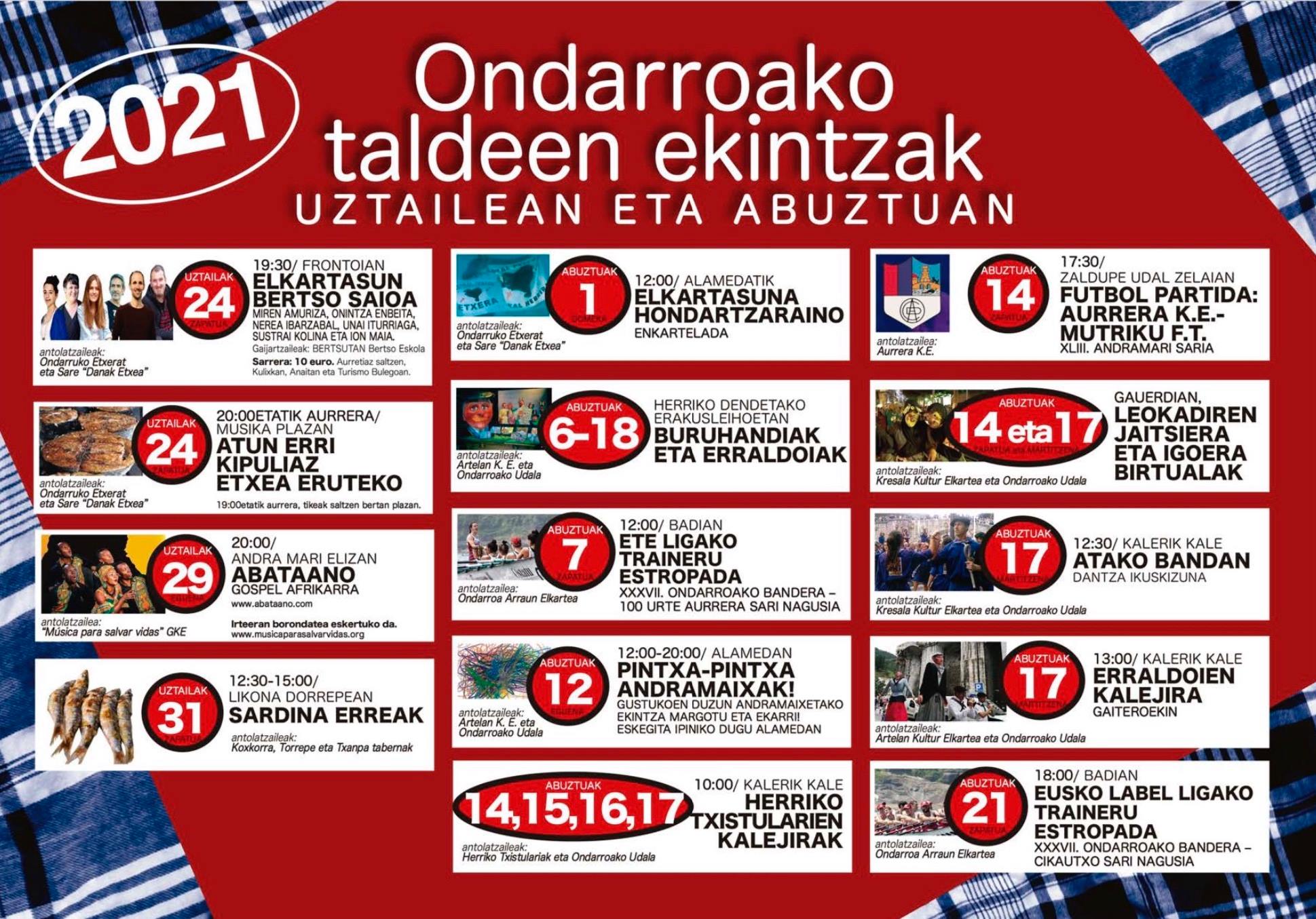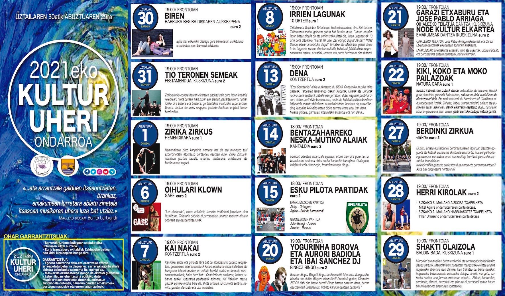 Hamen dakazue aurtengo KULTUR UHERIk eskeintzen doskun egitarau, uztailan 30etik abuztun 29re Ondarrun. Ondarruk Covid-19ak eragindako pandemixa egokitutako kultur eskaintzi dakar aurtengo udan, Udalan eta herriko taldin eskutik. Edade guztixentzako pentsatako ekitaldixak ixango diz, abeslaxak, dantzaxak, pallazuk, bertsolaxak, kirol emanaldixak….gero baten batek esateko herrixan ez dala ixe egoten.