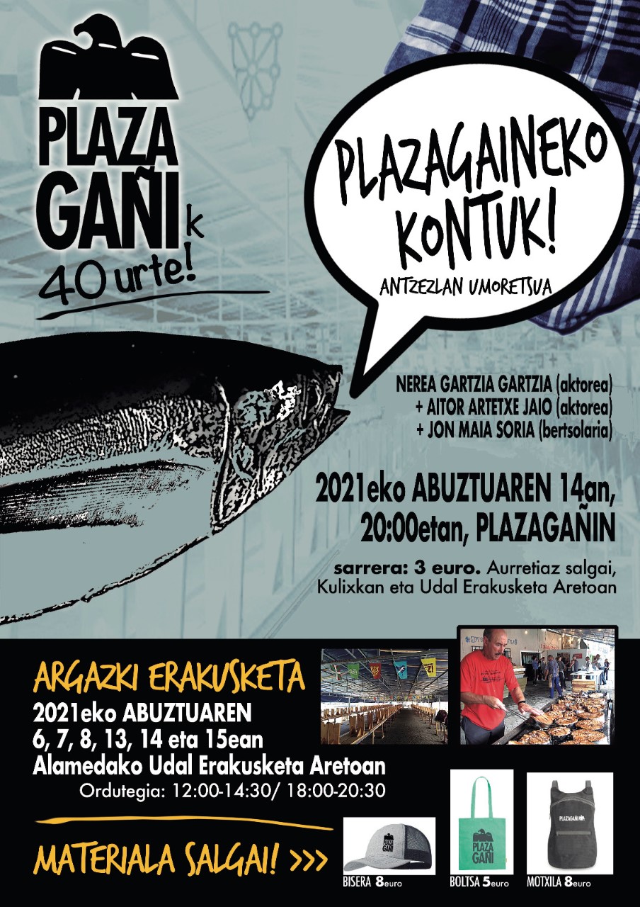 Ta ezin gendun hutsik ein PLAZAGAÑIai ta hori holan dala erakusteko Abuztuak 14 an illuntzeko 8 retan PLAZAGAÑEko KONTUK antzezpen umoretsu eskeñikozku bertan. PLAZAGAÑEKO hiru partaidek: Zelan ez, JON MAIA SORIA bertsolaxak, NEREA GARTZIA GARTZIA eta AITOR ARTETXE JAIO antzeslaxak barre algarak ata eraingozkule baieztatuzku . Berta juteko sarrerak saltzen eongo diz : KULIXKA tabernan eta Udal erakusketa aretun 3 euron trukin.