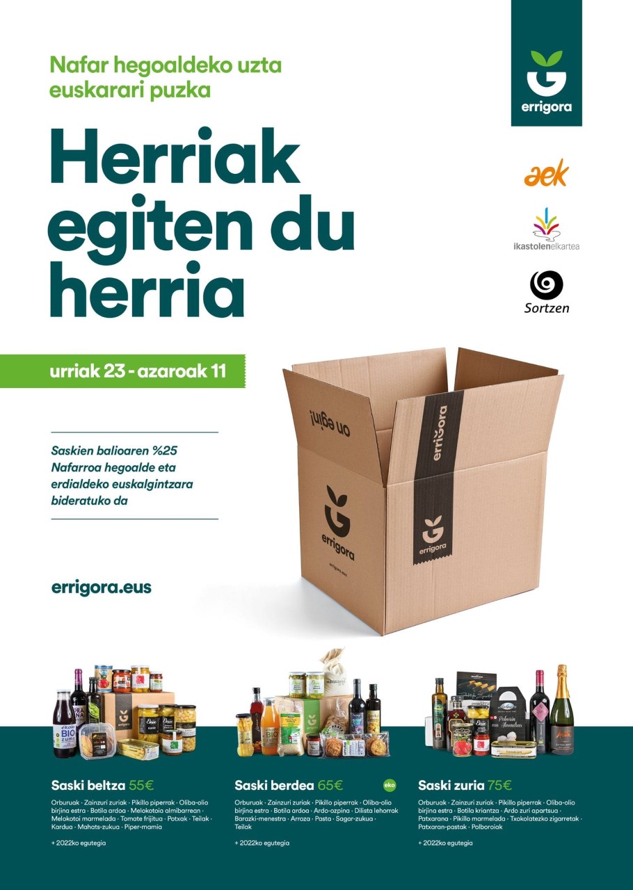 Eskatu saskixak urrian 23tik azarun 11a bitartin eta emon hauspoa Nafarroa hegoalde eta erdialdeko euskalgintziai. Agerraldixan kantik esaten daben latxeik, «geuk egiten ez badugu, ez baitu inork egingo» Nafarroako hegoaldin eta erdialdin euskerin ezagutzi bultzatzi eta erabileri sustatzi diz ERRIGORAko saskixakin ataten dizen irabazixan helburuk. Bota esko bat eta erosi saskixe! Sartu: https://www.errigora.eus