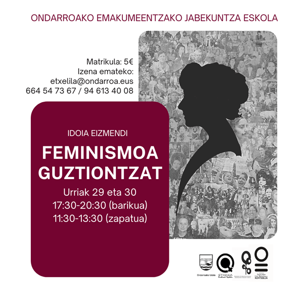 Ikastaruai buruz: Feminismu gorakada handiko unea bizitzen ari da, eta adin guztixetako emakumk hurbiltzen ari dira mugimendu horretara. Hala ere, askotan, eztabaidak oso eskuragarriak ez diren eta nahiko konplexuak diren kontzeptu eta ideiez beteta daude, eta horren ondorioz, ez dira beti ulertzen. Tailer honen helburua da feminismoaren oinarrizko kontzeptuak eta proposamenak ezagutzea modu erraz eta ulergarrian. Lan egingo dugu parte hartzeko metodologiaren bidez, une teorikoagoekin uztartua.