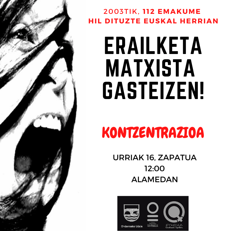 Beste emakume bat eraila Euskal Herrixan. Martitzenin emakume bat hill ben Gasteizen ta hori salatzeko konzentraziñoi bat eingo da ongoxe zapatun (U-16) Alamedan eguerdiko 12 xetan. Aurten, bost emakume hil dabe indarkeixa matxistin eragiñez Euskal Herrixan.