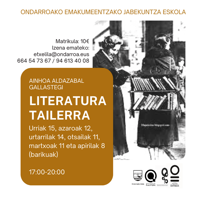 Irakasli: Ainhoa Aldazabal Gallastegi, Euskal filologian lizentziatu, literatur kritika feministan formatute eta Skolastikako kidi. Egutegixe: urriak 15, azaroak 12, urtarrilak 14, otsailak 11, martxoak 11 eta apirilak 8 (baixakuk). Ordutegixe: 17:00-20:00 Leku: Etxelila Antolatzaili: Etxelila eta Udaleko Berdintasun Saila Matrikula: 10 €