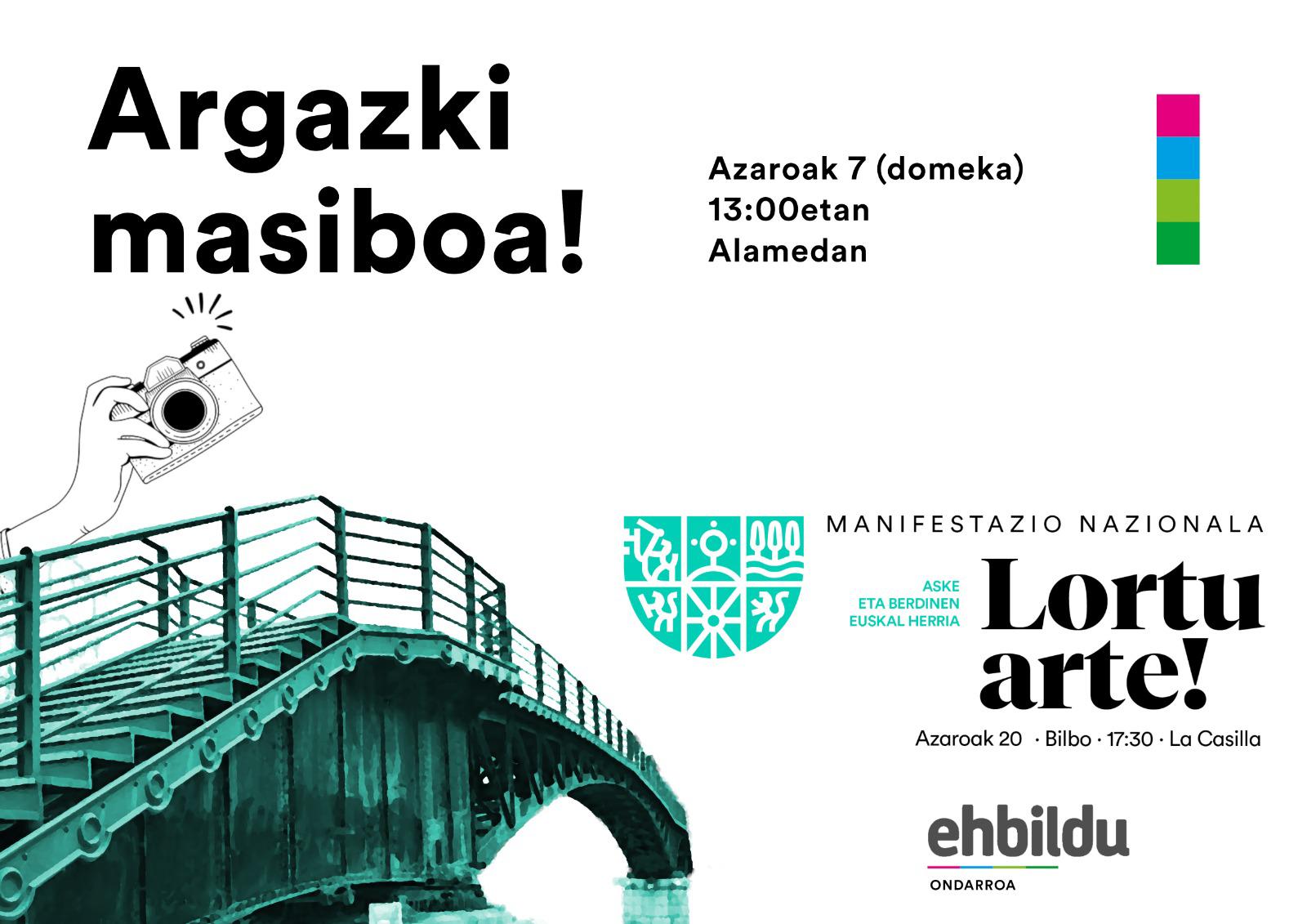 Ongoxe domekan (A-7) Alamedan batuko gaz LORTU ARTE! ekimenaz bat eitteko. Herriz herri Euskal Herri osun ataten dazen argazkixakin bat eingou Ondarrutarrok domekan eguerdiko ordu batetan atako douen argazkixaz, ta Azarun 20 an danok Bilboa. Autobuse atako da berta juteko ta ixenak ANAITASUNA eta KULIXKA tabernetan emon birkodiz.