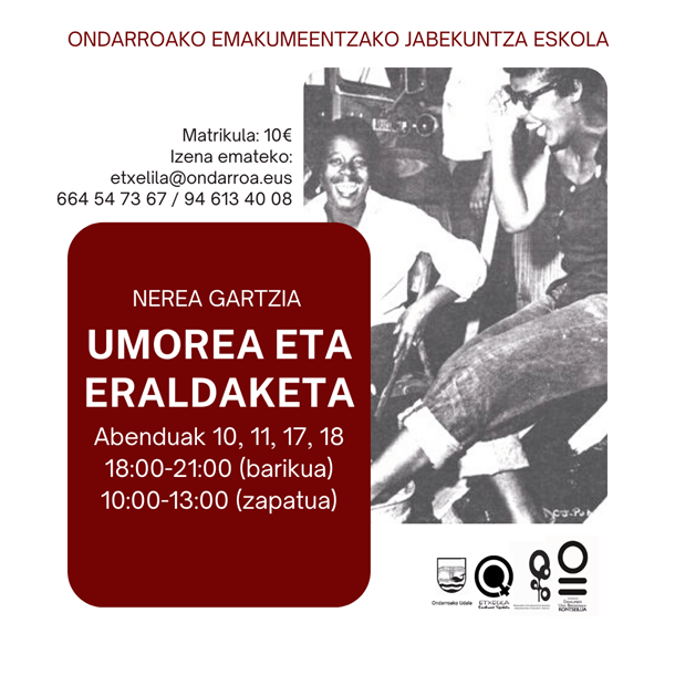Irakasli: Nerea Gartzia, aktori eta antzerki foro soziala lantzen aditu. Egutegixe: Abenduak 10, 11, 17, 18 Ordutegixe: 18:00-21:00 (baixaku) / 10:00-13:00 (zapatu) Leku: Etxelila Antolatzaili: Etxelila eta Udaleko Berdintasun Saila Matrikuli: 10 €. Ixena emoteko matrikula fitxa bete eta ordainketi ein bihir de. Goxetan, Udal Diru-Bilketa bulegun (Kantoipe 3an) egiteko aukeri egongo da, eta arratsalditan, Etxelilan (Artibai 3, goiko pisun).