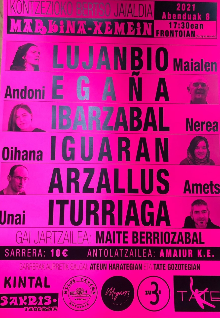 Ez da ohiku Turrunin herritxik kanpoko albisteik sartzi bañe ikusirik herrittar pillu juten dala urtero etxen dan bertso jaialdi honeta, egokixe eritxi gazku propaganda bixkat etxi aldaketak ikusi douzelako aurtengo emanaldixan ingurun. Aurten estreiñakoz (guk dakiauela behintzat) aurretik ipinikotxue saltzen sarrerak: TATE gozotegixan eta ATEUN harategixan 10 euron trukin. Primerako bertsolaxak entzuteko aukeri eukikou aurten be, MAIALEN, ANDONI, NEREA, OIHANA, AMETS eta UNAI. Antolatzalle lez, AMAIUR elkarti.
