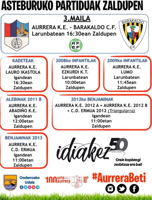 Honek diz AURRERAko futbol talde desberdiñak Zaldupen jokatuko dotxuen partidun egunak eta ordutegixak.