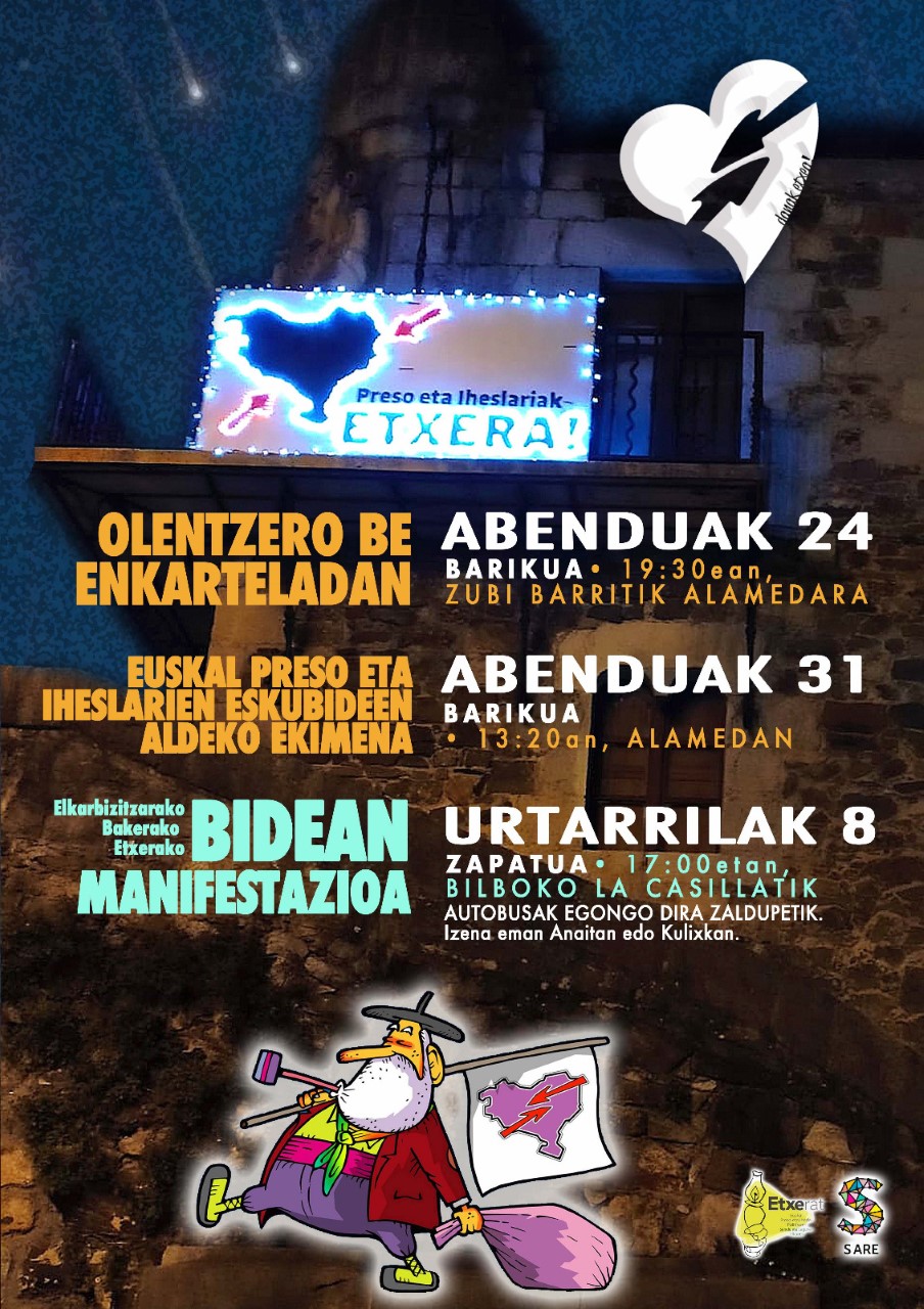 Beste urte amaiera bat eta gure herriko etxe batzutan aurten be hutsunak egongo diz. Hori gogoratzeko eta eurakin ez gazela ahazten aldarrikatzeko, hainbat ekimen antolatu dabe herrixan SAREk eta ETXERATek abenduak 24 eta 31 eako. 2022 rako be urteroko deialdixe eindde da, Urtarrillak 8 xan danok BILBOA!
