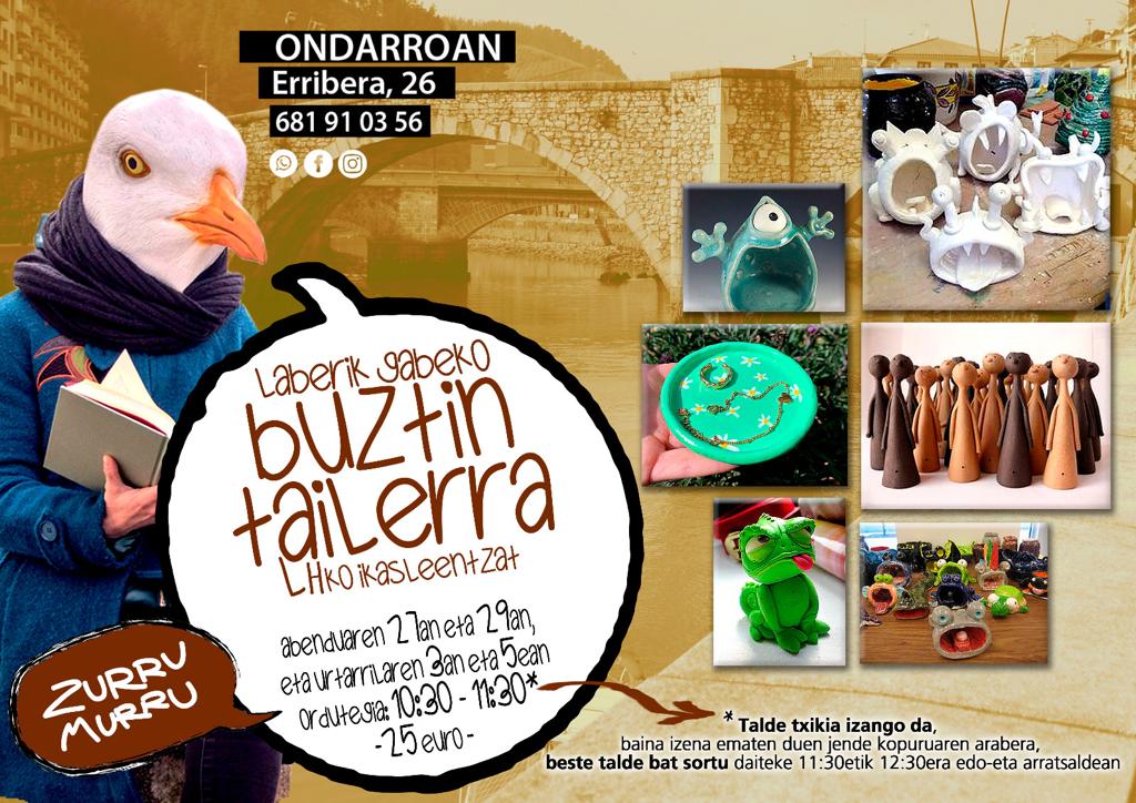 ZURRUMURRU liburu dendi ezta geldik egoteko ta gabonetako oporretan LHko ikaslintzako labaik bako buztin tallerrak antolatutxu. Talde txikixak ixango dizenez lelengotik ixenak emoti gomendatzen dosku behian agertzen dan telefono zenbakixan. Zer egunetan eta zer ordutegi eukiko daben be ikusiko dozue bertan.